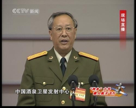 陳炳德:在這舉世矚目、激動(dòng)人心的重要時(shí)刻,請(qǐng)?jiān)试S我首先介紹一下前來視察指導(dǎo)的黨和國(guó)家領(lǐng)導(dǎo)人,親臨北京航天飛行控制中心視察指導(dǎo)的有:中共中央總書記、國(guó)家主席、中央軍委主席胡錦濤同志,中共中央政治局常委、國(guó)家副主席曾慶紅同志,中共中央政治局常委、國(guó)家政協(xié)主席賈慶林同志,中共中央政治局常委、中央紀(jì)委書記吳官正同志。親臨酒泉衛(wèi)星發(fā)射中心的有,中共中央政治局常委、國(guó)務(wù)院總理溫家寶同志,中共中央政治局常委李長(zhǎng)春同志,中央政法委書記羅干同志,中央政治局委員、中央軍委副主席、國(guó)務(wù)委員曹剛川同志,還有全國(guó)人大、國(guó)務(wù)院、全國(guó)政協(xié)的領(lǐng)導(dǎo)。